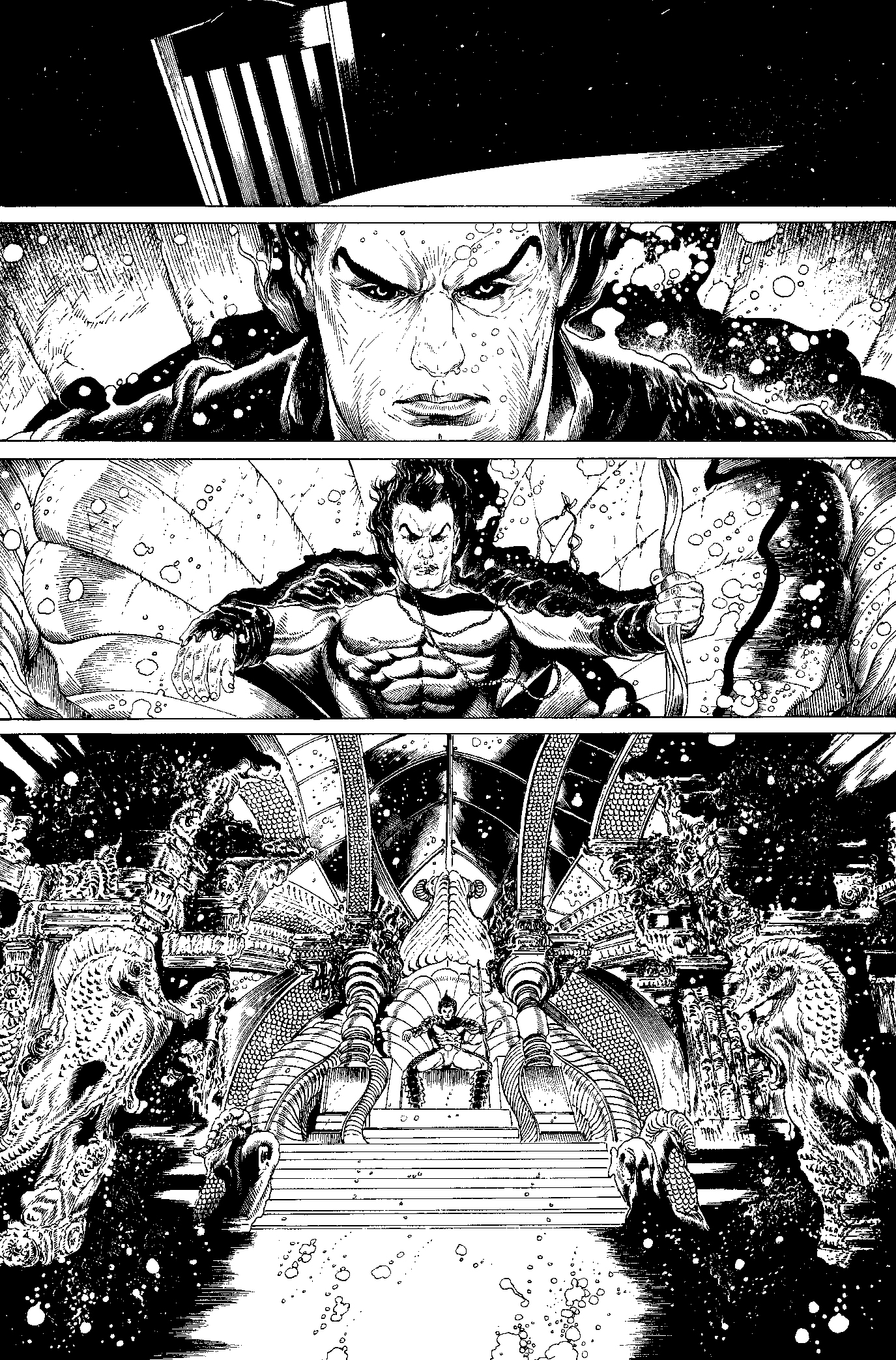 Entonces tras discutir estos detalles, empiezo las páginas a lápiz y hago dos diarias aunque para eso tengo que levantarme a las cinco de la mañana y estar entre doce y trece horas trabajando. En dos semanas tengo el número terminado, cuando todo está aprobado empiezo a entintar lo que me lleva otras dos semanas. Si todo está bien envío el material a mi editor, y me tomo un día o dos de descanso antes de empezar de nuevo.