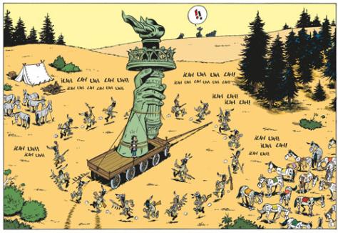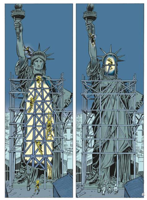 En esta ocasión el protagonista se cruzará en el camino del escultor Frédéric Auguste Bartholdi, padre de la Estatua de la Libertad, junto al ingeniero Alexandre Gustave Eiffel (sí, también artífice de la torre que lleva su nombre). Un encuentro que entronca con la vertiente más clásica de Lucky Luke, puesto que es bastante habitual que en sus andanzas termine frente a frente de grandes nombres de la historia como Calamity Jane, el juez Roy Bean, o Sarah Bernhardt (en mi historia favorita) y otros tantos personajes históricos (si queréis saber más de este tema, os recomiendo el libro Les personnages de Lucky Luke et la véritable histoire de la conquête de l´Ouest).